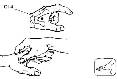 1. Произвести точечный массаж (акупрессуру) точки Дзин-тю, Т26, 6-10 надавливаний концом ногтя большого пальца
