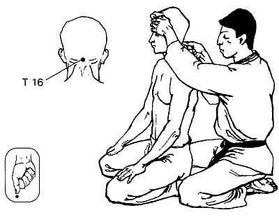 4. Положить ладонь левой руки на лоб, а большим пальцем надавить на точку А-мон, Т16, удерживая давление 56 секунд. Повторить 56 раз.