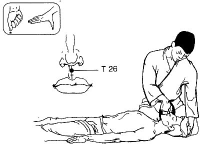Дзин-тю, Т26 несимметричная, находится на средней линии под носом, в верхней трети вертикальной борозды верхней губы. Одна из важнейших точек, используемых для оказания неотложной помощи. Применяется при обмороке, шоке, коллапсе, отеке головного мозга, головной болн.