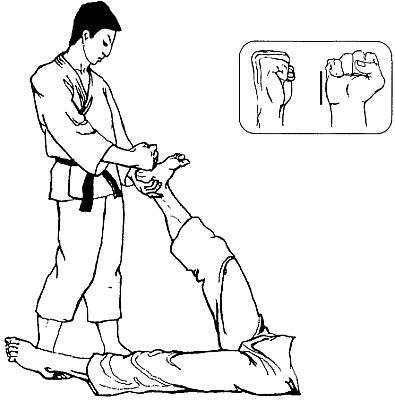 15. Цумасаки (хокосаки или аси-ноюби) «копьё из пальцев ноги». Удар наносится кончиками первого и второго пальцев стопы, напряженных и прижатых друг к другу. Применяется в Дзиндзо-катсу, Кокю-катсу.