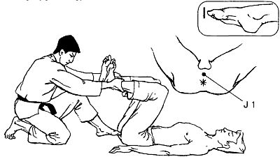1. Производится акупрессура точек Ю-сэн, R1 большими пальцами рук в течение 12 минут.
