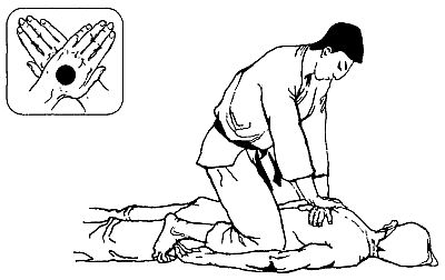Для этого пострадавший усаживается, колено устанавливается в его межлопаточной области, руки реаниматора располагаются в подмышечной области сидящего. Выполняем нажим коленом вперед с одновременным нажимом руками назад. Произвести ритмичные движения с частотой 1820 в минуту.