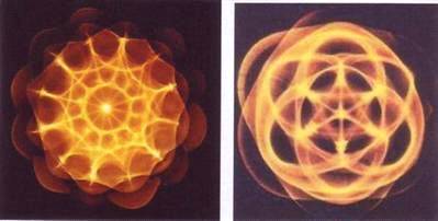 Одна и та же капля воды и тем же самым песком будет создавать абсолютно разные геометрические паттерны, включая куб, в зависимости от того, какой звук мы играем. Как можно видеть, на определенных звуковых частотах появляется определенный паттерн треугольников трехмерная Звезда Давида. Это паттерн обладает потрясающими сходствами с треугольной формой, открытой нашими учеными из Калтека как семя вселенной.