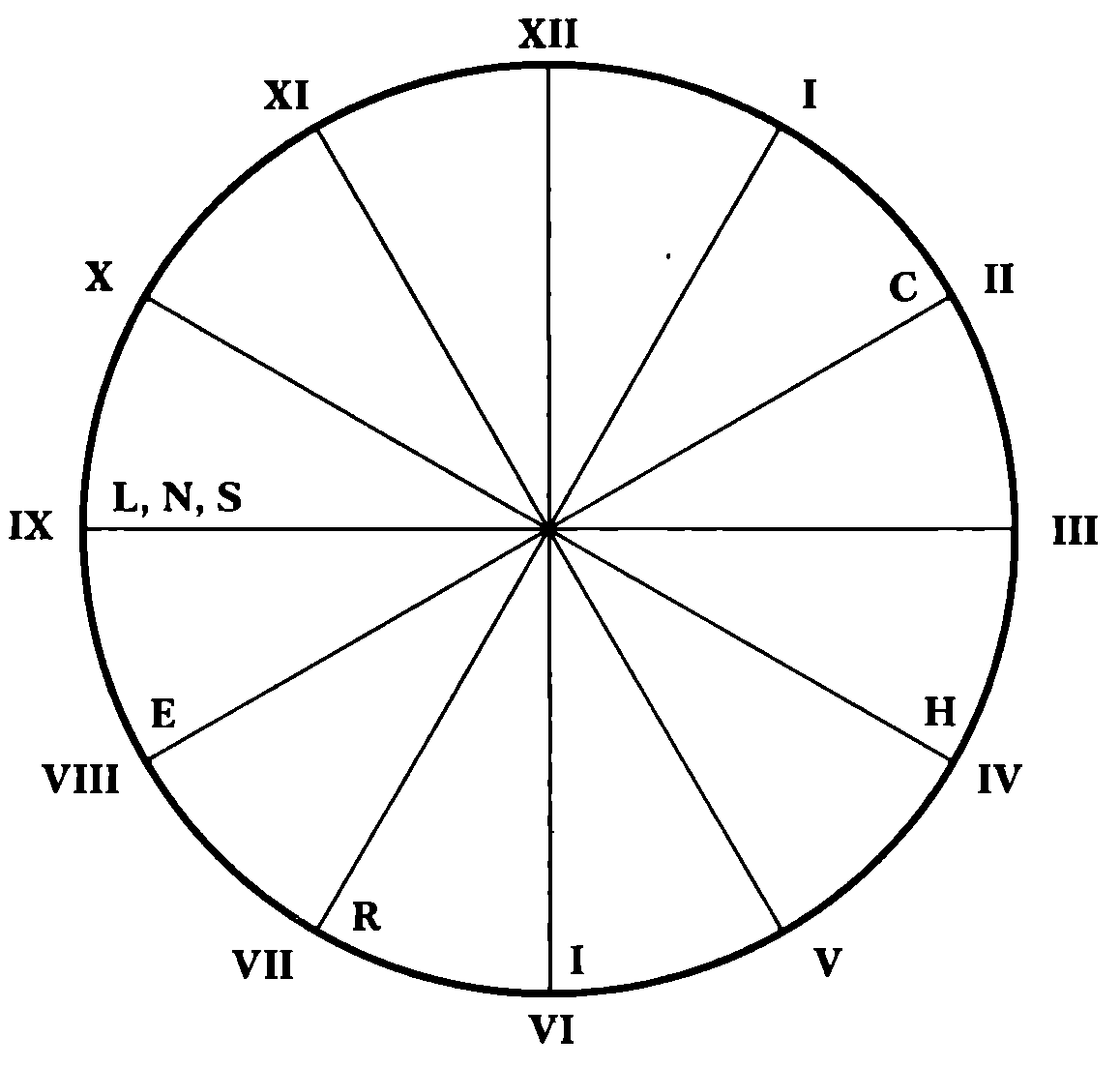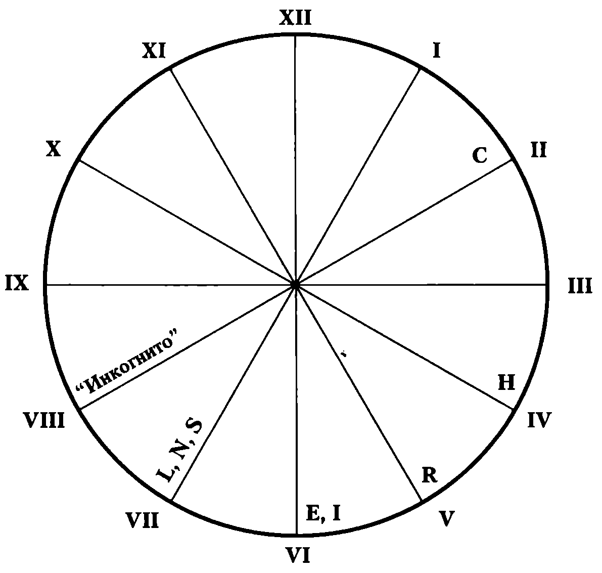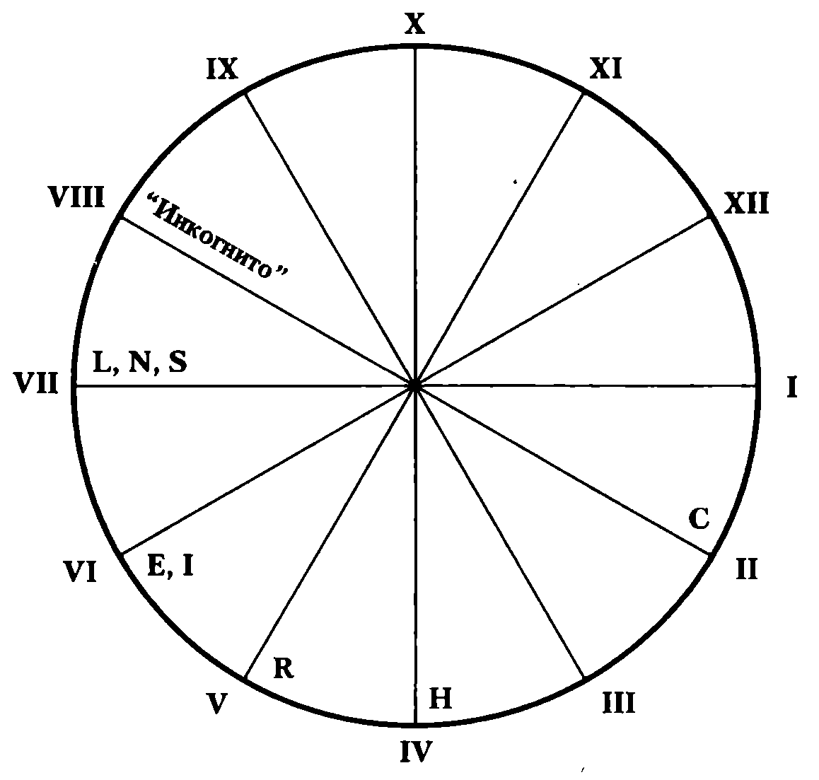 Возвращение "механической" системы в это квазиисходное состояние, то есть состояние, когда буква "R" снова совместилась с позицией "VII", характеризуется следующим взаимным расположением букв и цифр на циферблате (см. рис. 4):