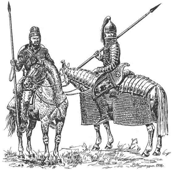«Копьё же острым концом далеко выдаётся, прямо привязано будучи к лошадиной шее; самый же ремень от копья, собранный, привязывается к верху ноги лошадиной, которой в сражении не только не убавляет силы, но при том делает помощь руке конного, коему оставалось единственно бросать прямо и метить. Итак, когда он вытягивался и шёл далее, противник противлением жёстче делал стремление для удара, то конный всякого попадавшего насквозь пробивал, а иногда и двух одним разом» (307, с. 97).