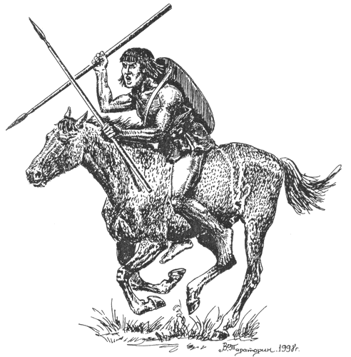 В третью шеренгу (или во вторую и третью) ставились конники, вооружённые дротиками, иногда снабжёнными ремнём-аментатой, благодаря которому увеличивалась дальность броска , либо копьями.