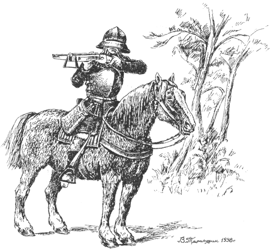 В самом деле, ведь не могла же идея этого строя заключаться только в том, чтобы, избежав губительного обстрела, тут же образовать толпу и броситься на противника, в то время, как тот стоял, плотно сомкнув ряды. Нам кажется, ответ на этот вопрос надо искать в конной тактике XIX в. Ведь, в сущности, принципы построения её не изменились и тогда, хотя оружие стало совершеннее, а число шеренг в строю сократилось. Конечно, форму клина к тому времени уже не использовали, но оставалась манера атаки колонной, которая (если не считать острого конца передней части строя) была идентична античной или средневековой колонне (271, с. 157 163). А чтобы противник, построившись в одну линию, не смог охватить колонну с флангов, её отнюдь не отправляли в битву единой массой, где взводы следовали друг за другом на кратчайших расстояниях. Дойдя до нужной точки, командир останавливал построение и посылал в атаку только передний взвод (или эскадрон), состоящий из двух шеренг всадников. Остальные стояли до поры, и, если отряд врага пытался обойти атакующий взвод с фланга, то на него тут же высылался следующий, и атаки, в свою очередь, производились во фланг вражеского построения, вознамерившегося окружить передовой отряд. Таким образом, ситуация полностью контролировалась командиром, и все фланговые нападения противника парировались контратаками (вправо или влево) очередных взводов, стоящих в строю колонны.