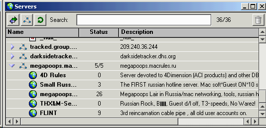 Укажите адрес и имя треккера и нажмите "Save". Как только в окне "Servers" появилась строчка с именем треккера, нажмите . В списке начинает расти список серверов.