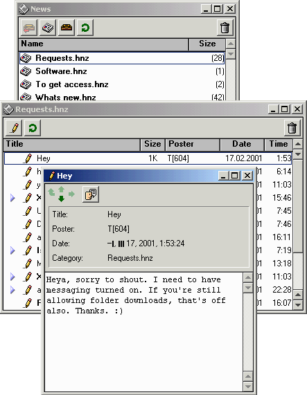 Вы и теперь можете встретить в Хотлайне массу сайтов, работающих под управлением сервера версии 1.2.3. Новым (версия 1.5 и выше) клиентом читать "старые" новости можно, а старым (версии 1.2.3) - нет, сервер вместо возвращает что-то вроде "для того, чтобы работать с новой, многопоточной системой новостей, вам нужен клиент версии...".