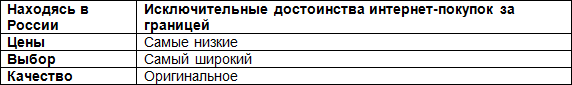 Табл. 3. Исключительные достоинства интернет-покупок за границей