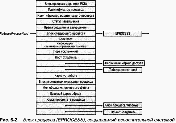 Для каждого процесса, выполняющего Windows-программу, процесс подсистемы Windows (Csrss) поддерживает в дополнение к блоку EPROCESS параллельную структуру данных. Кроме того, часть подсистемы Windows, работающая в режиме ядра (Win32k.sys), поддерживает структуру данных для каждого процесса, которая создается при первом вызове потоком любой функции USER или GDI, реализованной в режиме ядра.
