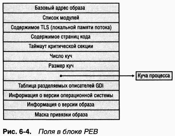 РЕВ, размещаемый в адресном пространстве пользовательского процесса, содержит информацию, необходимую загрузчику образов, диспетчеру кучи и другим системным DLL-модулям Windows для доступа из пользовательского режима. (Блоки EPROCESS и KPROCESS доступны только из режима ядра.) Базовая структура РЕВ, показанная на рис. 64, подробнее объясняется далее в этой главе.
