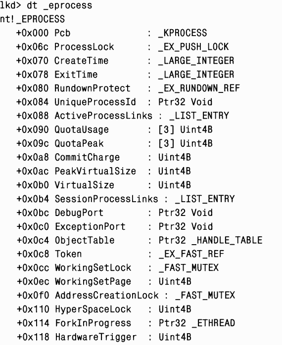 Список полей, составляющих блок EPROCESS, и их смещения в шестнадцатеричной форме, можно увидеть с помощью команды dt eprocess отладчика ядра (подробнее об отладчике ядра см. главу 1). Вот что дает эта команда (вывод обрезан для экономии места):