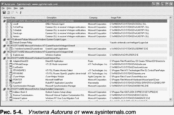 Многие пользователи даже не представляют, сколько программ выполняется в процессе их входа. OEM (original equipment manufacturers) часто конфигурируют свои системы с помощью дополнительных утилит, которые выполняются в фоновом режиме и обычно не видны. Чтобы увидеть, какие программы настроены на автоматический запуск на вашем компьютере, запустите утилиту Autoruns; Сравните полученный в Autoruns список с тем, что показывается Msconfig (доступной в Windows XP и Windows Server 2003), и обратите внимание на различия. Потом попробуйте разобраться в предназначении каждой программы.