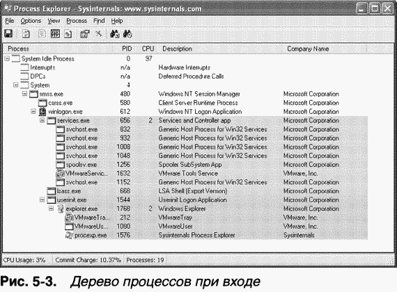 Далее Winlogon уведомляет зарегистрированные провайдеры сетей о входе пользователя. Провайдер сети Microsoft, маршрутизатор многосетевого доступа (Multiple Provider Router, MPR) (\Windows\System32\Mpr.dll), восстанавливает постоянные подключения к сетевому диску и принтерам, установленные пользователем; эти сопоставления хранятся в HCU\Network и HKCU\ Printers соответственно. Ha рис. 53 показано дерево процессов, которое отображается в Process Explorer при входе до завершения Userinit.