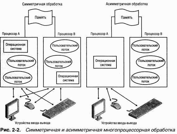 итуже память. При асимметричной многопроцессорной обработке (asymmetric multiprocessing, ASMP) система, напротив, выбирает один из процессоров для выполнения кода ядра операционной системы, а другие процессоры выполняют только пользовательский код. Различия между этими двумя моделями показаны на рис. 22.