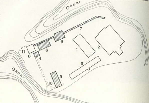 1 соборная церковь Иоанна Богослова 1689 г. (перестроена в 1861 г.); 2 Успенская церковь XIX в.; 3 колокольня XVII в.; 4 святые ворота 1658 г.; 5 настоятельский корпус XVII в.; 6 ледник XVII в.; 7 монастырская ограда XVII в.; 8 колокольня, 1901 г.; 9 братский корпус XIX в.; 10- северная стена (не сохранилась); 11 ворота и ограда XX в.