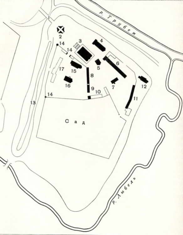1 мост; 2 колокольня; 3 Успенский собор; 4 Христорождественский собор (старый Успенский собор); 5 Архангельский собор; 6 архиерейский дом; 7 Певческий корпус; 8 Консисторский корпус; 9 конюшня XVII в.; 10 конюшня XVII в., XIX в.; 11 гостиница черни; 12 церковь святого Духа; 13 оборонительный вал; 14 ограда Спасского монастыря; 15 Богоявленская церковь; 16 Спасо-Преображенский собор; 17 гостиница знати