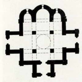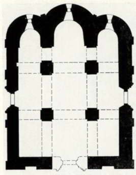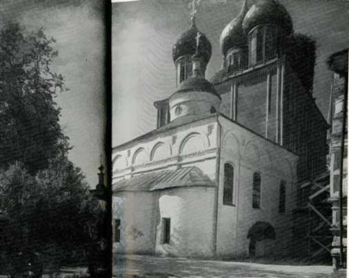 Поэтому следует еще раз вернуться к плану Спасского собора. Его боковые приделы, будучи пространственно связаны с центральным помещением, придают храму отчетливо выраженную поперечную направленность, тот характер предстояния", который был типичен во время раннего средневековья для церквей переднего Востока (монастырь в Хартамине, 512 г., и др.). Эта поперечная направленность отчетливо выражена и в композиции отдельных построек Балканского полуострова (церковь Пантелеймона в Охриде начала X в.) и даже отчасти Армении, в период ее подвластности арабскому халифату. Дальнейшие археологические раскопки еще, может быть, прольют дополнительный свет на особенности этого замечательного сооружения Старой Рязани.