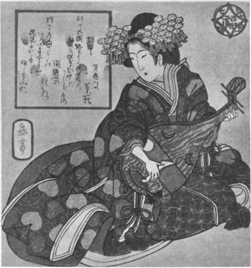 Гакутей. Девушка с бива (музыкальным интрументом). Суримоно.