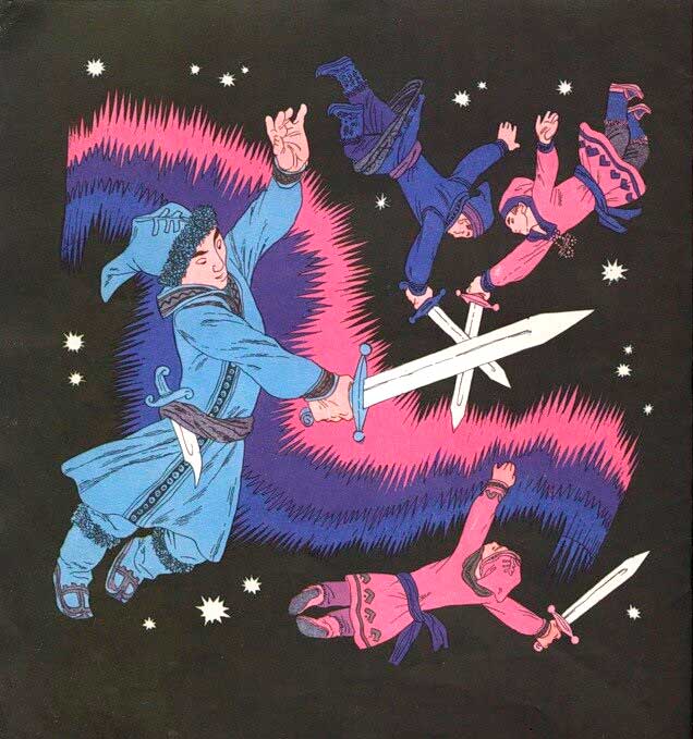 Сели братья за ужин. Поели стали играть, затеяли между собой битву. То схватятся врукопашную, то рубятся мечами. Белым огнём сверкает оружие, алые сполохи пляшут в небе.