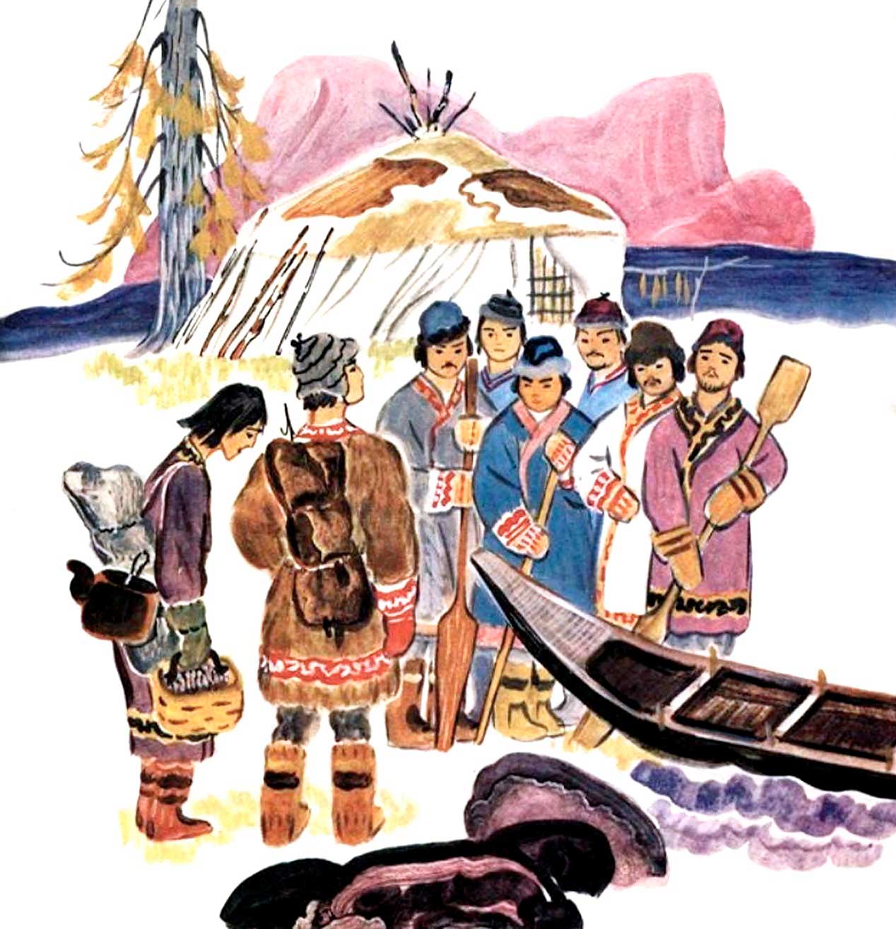 Они переехали на тот берег. Там жили младшие братья охотника, шесть богатырей. Один из братьев пошёл встречать лодку. А потом пришёл домой и сказал: