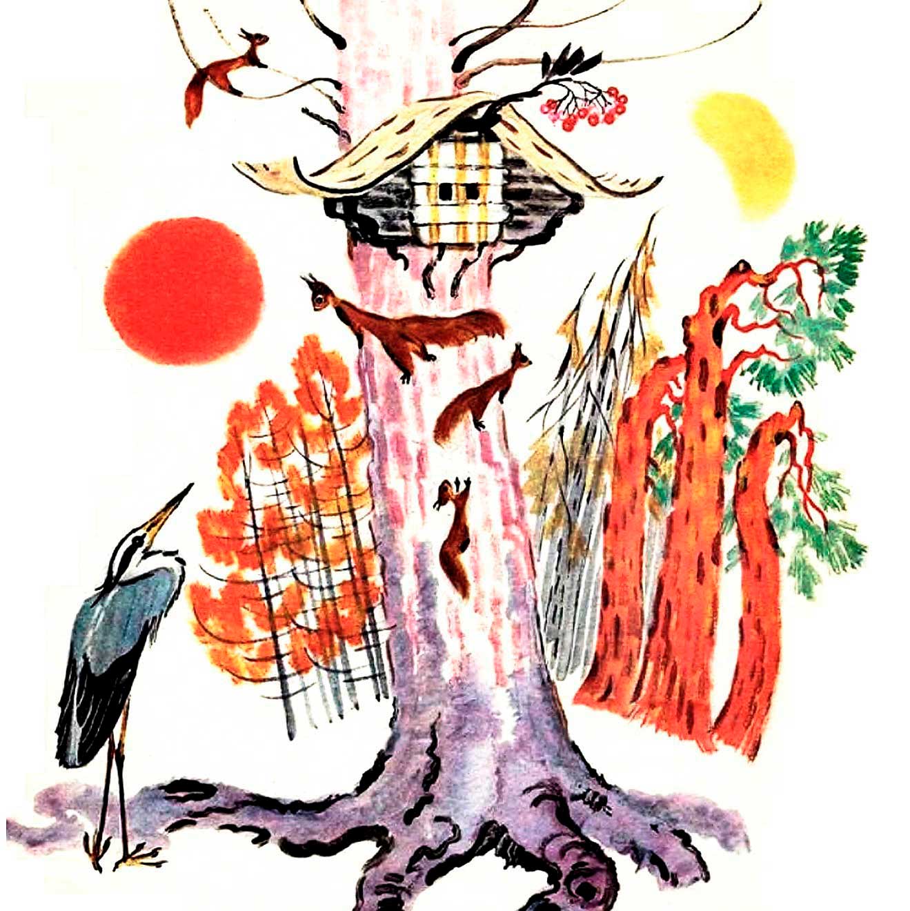 Не плачь, белка. И не верь лисе. Когда она снова придёт, скажи: Нет у тебя ни топора, ни вертела". А когда спросит, кто тебя научил, скажи: Цапля". И цапля полетела к морю.