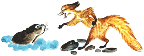И побежала лиса по головам к берегу. Бежит и приговаривает: Раз, два, три! Раз, два, три! Раз, два, три!" Перепрыгивает с нерпы на нерпу. Вот и берег. Прыгнула лиса на землю, уставила лапы в боки и хохочет: