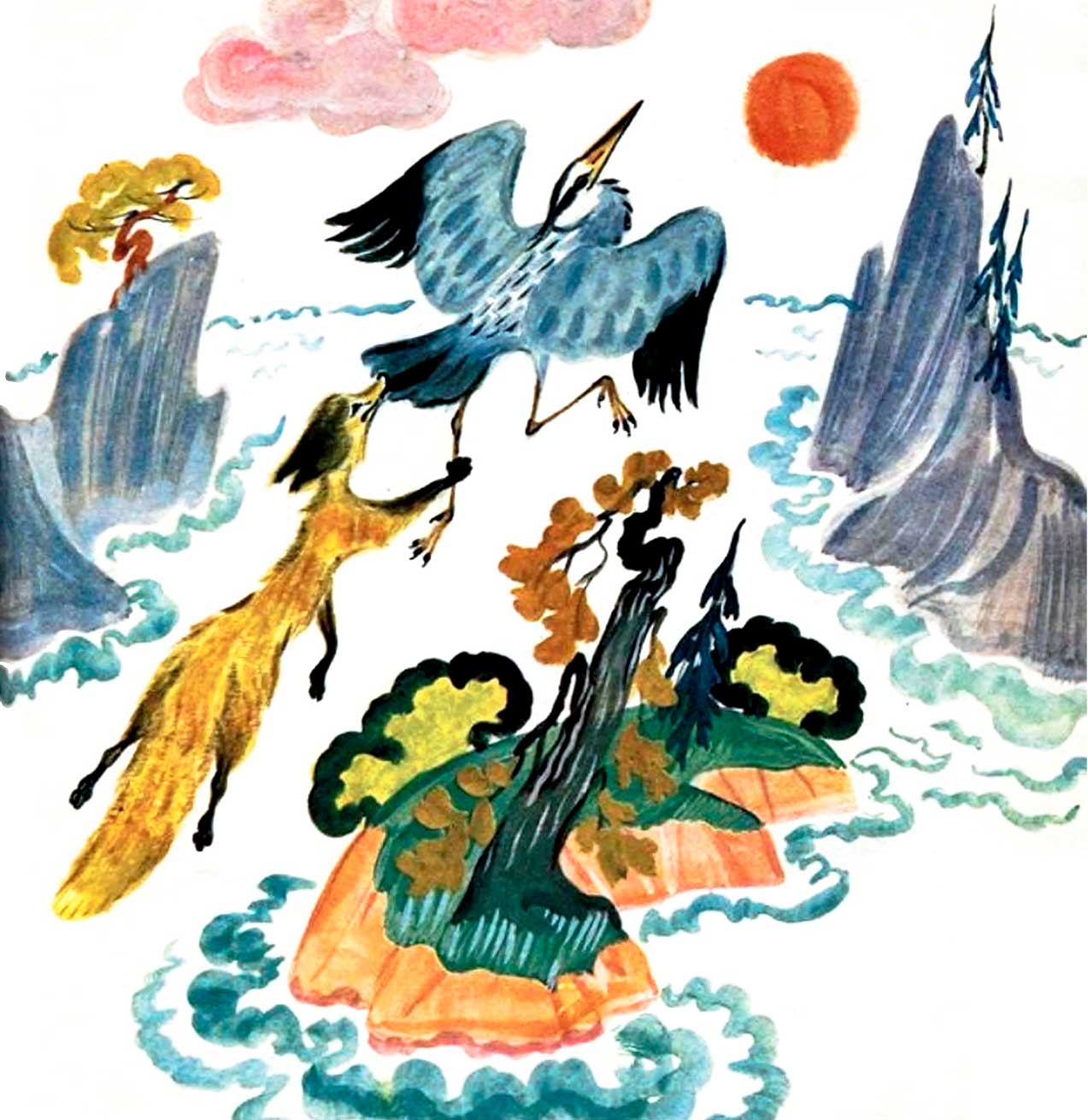 Я съем эту цаплю", подумала лиса и побежала к морю. Увидела цаплю и подкрадывается. Близко была лиса, а цапля взлетела. Лиса бросилась за ней и вцепилась в её хвост. И поднялась вместе с цаплей над землёй. Цапля полетела над морем. Лиса крепко держится. Внизу показался островок.