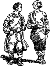 Вот показалась повозка, запряженная шестеркой гладких, холеных коней. На конях позлащенная сбруя, а в повозке восседает какой-то знатный муж. Корзно на нем синее с золотой каймой по низу, на правом плече золотая с жемчужиной запона (застежка). Распахнулось корзно, и видно под ним узкое одеяние алого цвета с золотыми петлицами. На голове шапка с красным верхом.