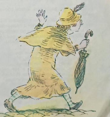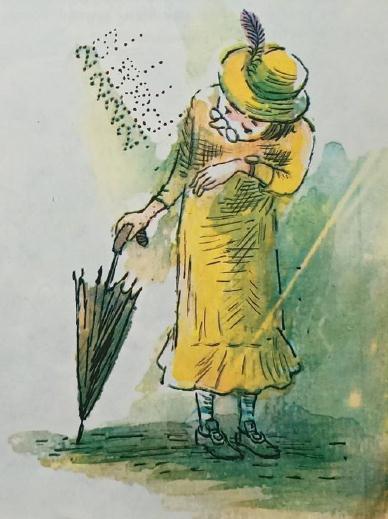 Смотрите, по городу, словно ракета, несётся старушка в жёлтом платье. Она то и дело поглядывает на свои «часы»,