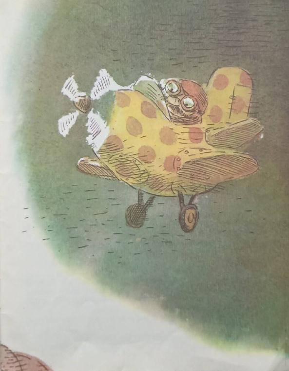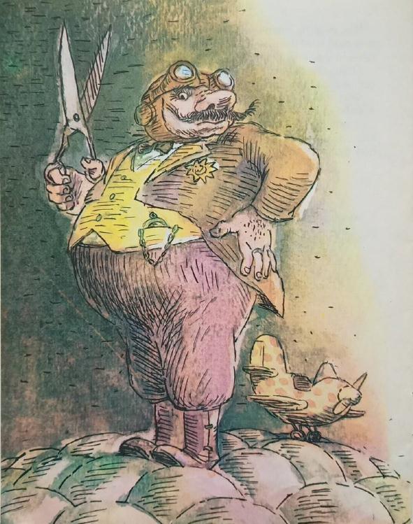 Самолёт, мягко ударившись о планету, сел. Из него вышел грузный человек с огромными ножницами в руках и деловито стал отрезать от планеты куски. Шарики лопались и, сморщившись, свисали по краям.