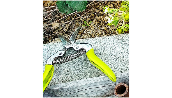 Обстригаю кусты ножницами садовыми, такими, как на фото ниже, с пружинкой между ручек. Секатор очень большой, а ножницы в самый раз, чтобы аккуратно обстричь большие листья вокруг и оставить средние зеленые листочки, пусть они уже работают на фотосинтез и питают корни.