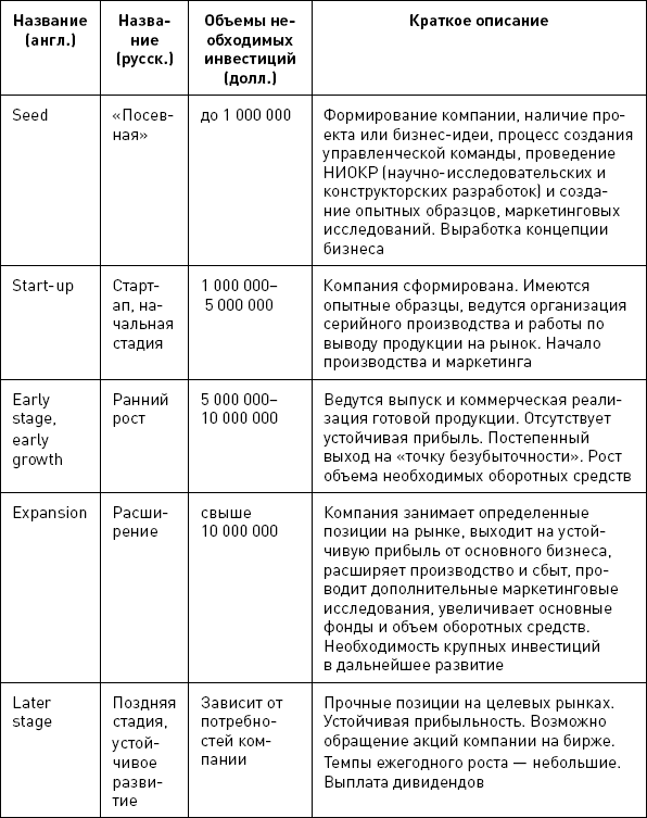 В таблице 2 приведено принятое в отрасли прямых и венчурных инвестиций разделение проектов на стадии развития.