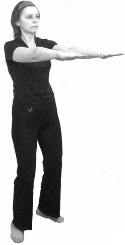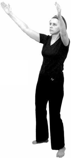 1. Руки постепенно поднимаем до уровня груди, потом до макушки (фото 5), потом тянем вверх, раскрываем ладони. Колени одновременно полностью распрямляются. Во время этого движения делается вдох и не прерывается, а длится и на следующем движении!
