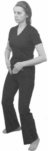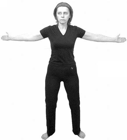 Исходное положение: Стоя, ноги на ширине плеч. Спина прямая. Грудь немного втянуть. Руки опустить вдоль туловища. Взгляд направить прямо перед собой. Колени немного присогнуты (как в предыдущем упражнении).