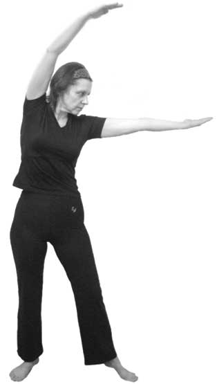 2. Центр тяжести тела переносим на правую ногу, немного сгибаем ее в колене. А левую ногу вытягиваем носком вперед (носок упирается в пол, пятка оторвана от земли). Делаем наклон влево левая рука прямая и постепенно оказывается в горизонтальном положении. Правая рука во время наклона описывает над головой полукруг. Вдох продолжается и во