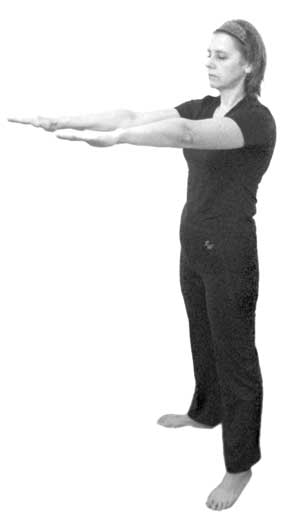 1. Обе руки поднимаем вверх (параллельно) до уровня груди, ладони опущены вниз (фото 3). На уровне груди ладони разворачиваем друг против друга и широко разводим в стороны до упора. Во время этого движения делается вдох через нос (фото 4).