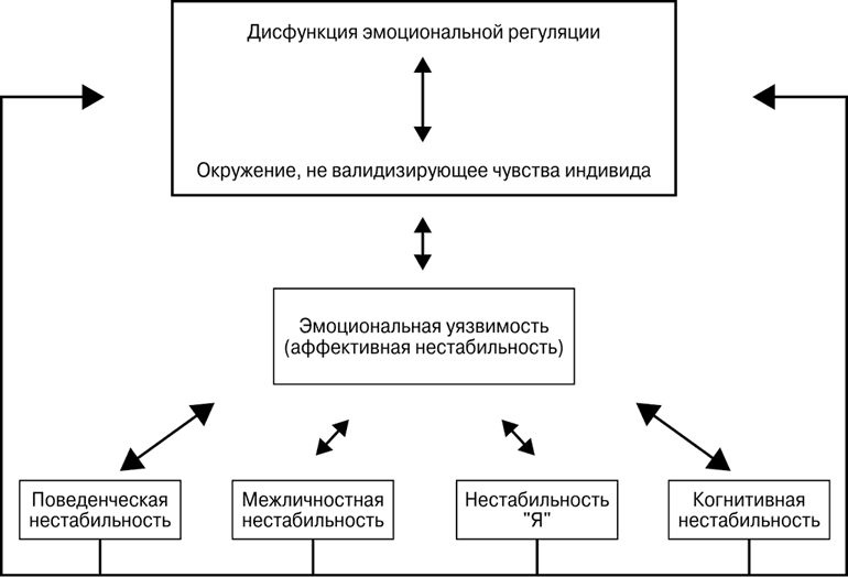 Рис. 2.2. Отношения между эмоциональной дисрегуляцией и моделями пограничного поведения с точки зрения биосоциальной теории
