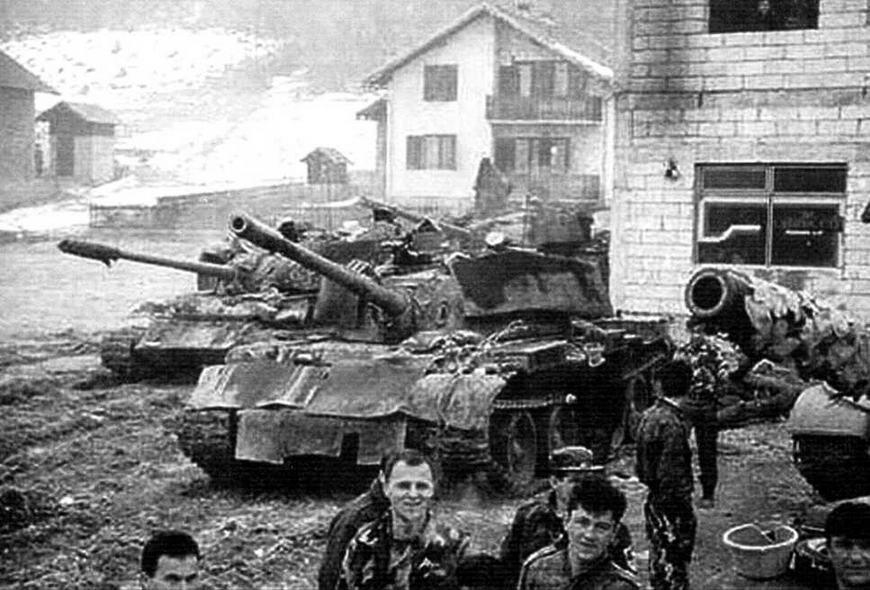 Танк Т-55А Македонии. Для дополнительной защиты на броню уложены мешки с песком. Март 2001 года