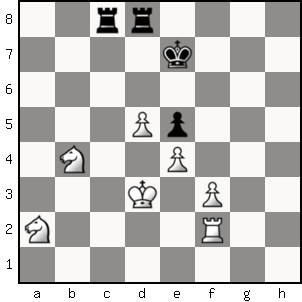Белые решили, что наносят завершающий удар и сыграли 1. Кc6+?, но не учли, что пешка «d5» связана. Последовало взятие 1. Л:c6. Все это видел тренер шахматистки, подставившей коня. Он сначала сильно разволновался, но потом успокоился. Шансы на выигрыш потеряны, но на пути достижения ничьей у белых нет никаких проблем. Партия продолжалась. На 2. Кb4 черные возвратили на место ладью 2. Лc8, а белые вновь, теперь уже второго, поставили коня на «c6». 3. Кc6+?? Естественно, и вторая жертва была принята 3. Л:c6.