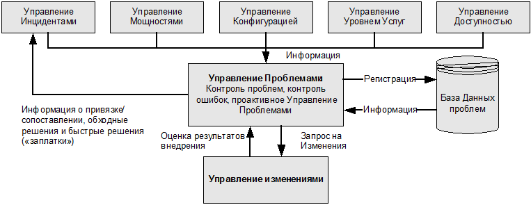 Управление Изменениями отвечает за контролируемое проведение изменений, включая Запросы на Изменения для устранения проблем, предложенные Процессом Управления Проблемами. Управление Изменениями несет ответственность за определение степени воздействия изменения и ресурсов, необходимых для его реализации, а также за планирование, согласование и оценку запрашиваемых изменений. Кроме того, Управление Изменениями информирует Процесс Управления Проблемами о ходе работ и о завершении корректирующих изменений. Оценка этим изменениям дается совместно с Процессом Управления Проблемами. Итогом работы является Анализ результатов внедрения, после которого в рамках подпроцесса Контроля ошибок может быть закрыта известная ошибка, а также относящиеся к ней (открытые) инциденты.