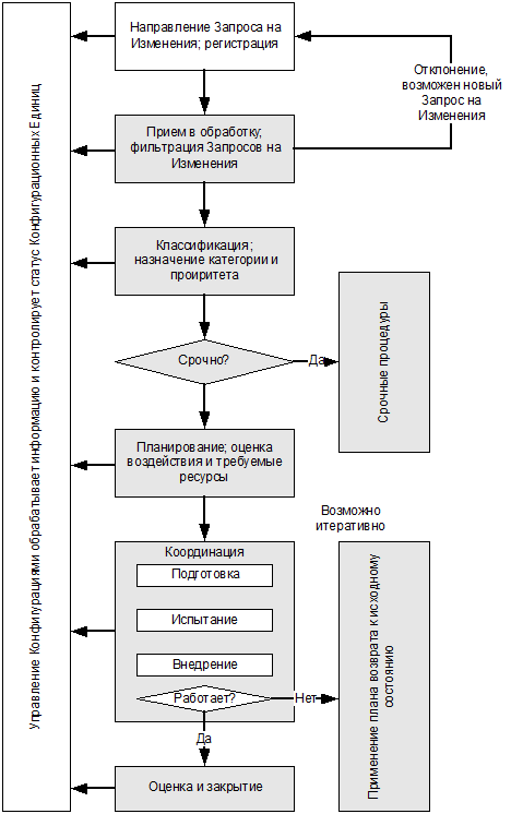 Изменения регистрируются под контролем Процесса Управления Конфигурациями, анализ воздействия изменений также проводится с участием Процесса Управления Конфигурациями. Управление Конфигурациями определяет зависимость между Конфигурационной Единицей CI (вовлеченной в проводимое изменение) и другими CI, чтобы определить, на какие другие элементы будет воздействовать это изменение.