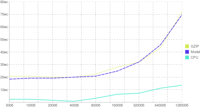 Рис. 2.3 . График реальных и модельных издержек на gzip-сжатие