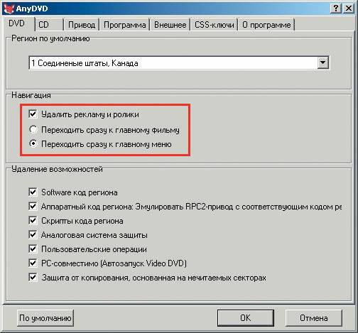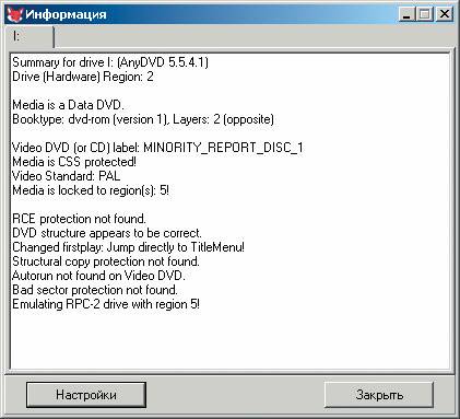 Невелика защита: CSS (Media is CSS protected!) да региональная блокировка (Media is locked to region: 5) . Как видите, Any DVD мгновенно расправилась с этим недоразумением. Ко всему прочему, на вкладке DVD в разделе «Навигация» можно включить опцию для удаления всевозможных сообщений о копирайте и рекламной шелухи, что позволит сразу перейти либо к просмотру фильма, либо к главному меню диска ( ).