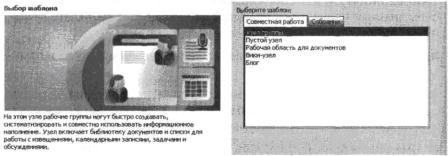 Первые три шаблона, перечисленные на вкладке Совместная работа (Collaboration) Узел группы (Team Site), Пустой узел (Blank Site) и Рабочая область для документов (Document Workspace) имеют скрытые возможности и область быстрого запуска. Шаблон Узел группы (Team Site) включает библиотеку Общие документы (Shared Documents) и четыре списка: