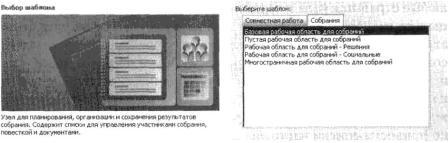 Пять шаблонов рабочих областей для собраний, перечисленные на вкладке Собрания (Meetings), являются вариациями на одну тему. В отличие от описанных выше шаблонов, они не имеют левой области навигации. Кроме обычных списков, таких как Библиотека документов (Document Library), Библиотека рисунков (Picture Library), Задачи (Tasks) и Доска обсуждений (Discussion Board), они могут включать и другие, такие как Повестка (Agenda), Участники (Attendees), Решения (Decisions), Цели (Objectives) и Необходимые предметы (Things To Bring).