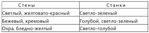 Стены, если они окрашены в хроматический цвет, также только частично справляются с такой функцией. Окраска их должна быть достаточно светлой (с коэффициентом отражения до 70%), чтобы максимально отражать световые потоки и не составлять резкого контраста с поверхностью окон. Стены окрашивают в желтоватые (светлые и теплые), зеленоватые (светлые и прохладные) и сходные с ними тона и оттенки (нюансные или мягко контрастные к цвету оборудования).