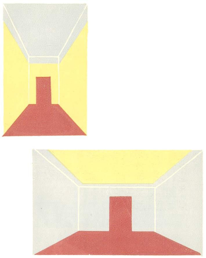 Рис. 16. Односторонне подчеркнутая окраска вызывает зрительное изменение пропорций помещения: увеличение высоты при вертикально подчеркнутой окраске (слева), расширение помещения при горизонтально подчеркнутом цветовом строе (справа).