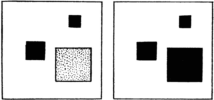 Рис. 4. Уравновешивание цветовой среды. Два небольших ярко окрашенных квадрата и большой неинтенсивно окрашенный квадрат взаимно уравновешиваются (слева); при равной интенсивности цвета равновесие нарушается (перевес большого квадрата справа).